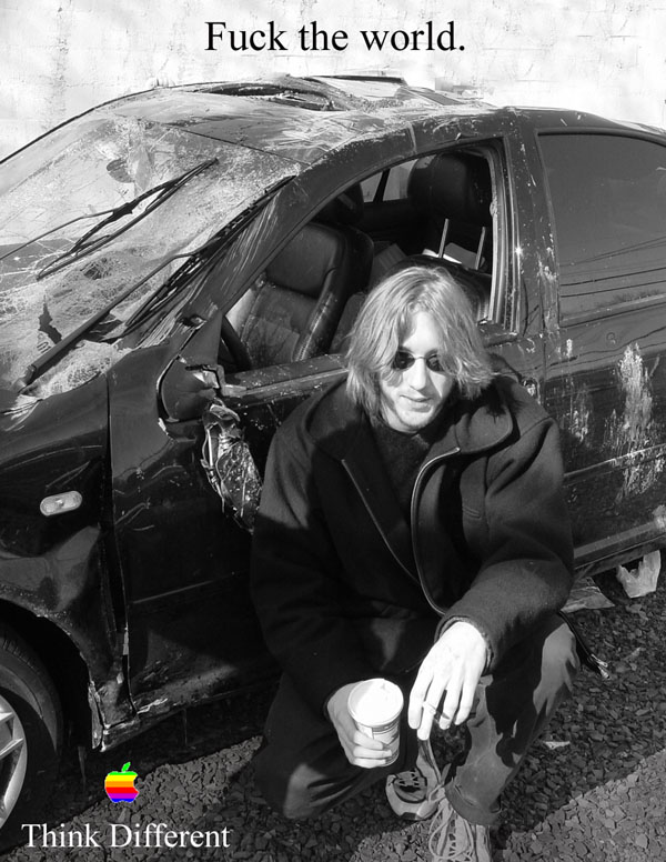 Hunter didn't let a small car wreck stop him. This is from the morning after, reclaiming his wallet from the console. It made a nice ad parody.