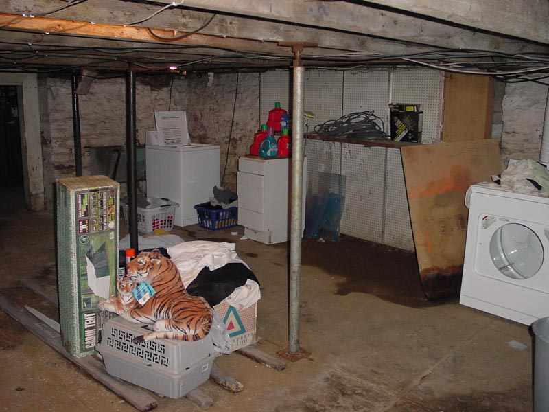 As we enter the Great Hall, our eyes are greeted with the veritable buffet of pleasing aspects in the layout, decor and design. This is an old farmhouse, and as such the floor features hand-poured and non-level cement, the ceiling is at the airy height of 5'8" or so. The decor is strongly typed with cobwebs and dim lighting. Spaciously placed around the room are floor-jacks to support the hundred-years-old hand cut floor beams. Noted in the decor is that items are stored up on boards and bricks for the inevitable seasonal flooding and puddling of water in a porous and natural stone basement. Once such is can be seen in the center background. Tastefully featured in the pile in the foreground is a brand-new and unboxed, amber monochrome monitor. Additional decoration feature piles of laundry being washed, and used wiring, plexiglass, and detergent bottles. [ Look left at the shelves | Look left towards the workbench | Archway to the lesser hall | What's back by the washer? | What's with all the detergent? | Look Right to by the Dryer | Turn around and look at why the step is wobbly | Head up the stairs and leave ] |