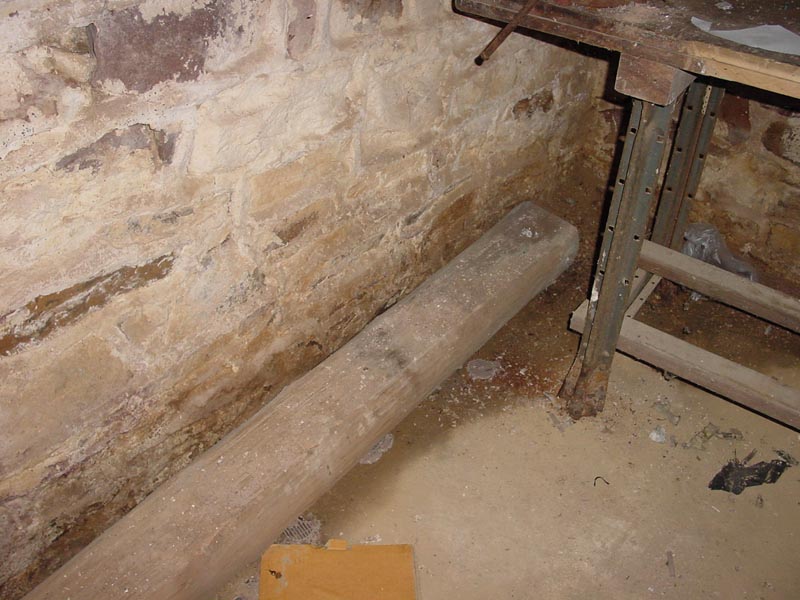One of the many cuious items residing in the basement appears to be a round, hand cut wood beam. It is likely oak or chesnut given it's apparent age. If you look at the end there is a large post-socket indicating it's either sufficiently aged or home-made construction. It is well preserved and due to the damp nature of the basement, quite heavy. [ Back ] |