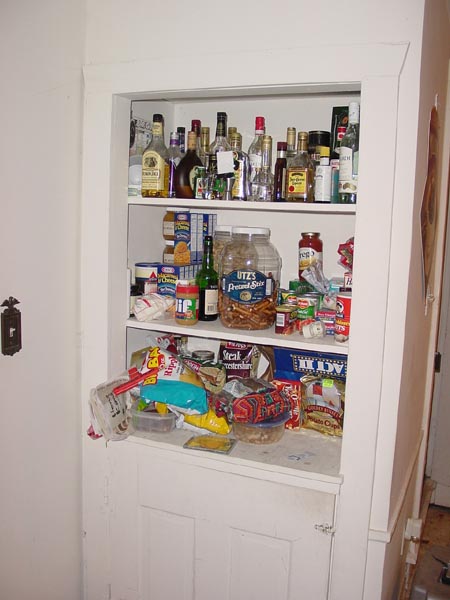 A very typical farmer's style in-the-wall cabinet resides here. It is surprisingly deep, giving ample room for old chinese take-out-menus and enough macaroni and ramen to choke a horse. Note the large and well-versed selection of high-caloric snack foods such as an enitre case of microwave popcorn, a barrel of pretzels, and no less than a half dozen (all open) bags of chips. The top cabinet is tastefully filled with cheap liquor. It's not a full blown bar, but it does have a satisfying spread of liquors that will get your hammered. Some of them are even in glass bottles. One or two don't have screw tops! [ Back to the basement door | What the heck is that in the middle of the alcohol? ] |