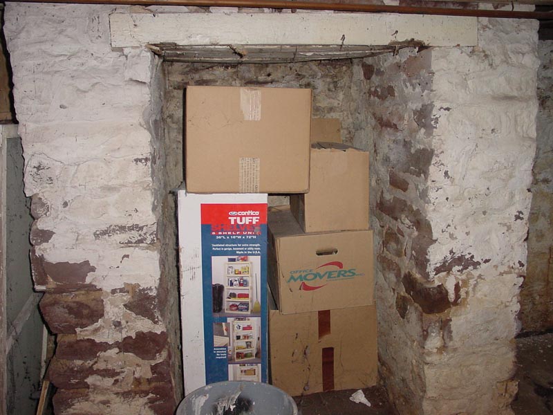 This cubby is created by the supports for the fireplace up in the main living-room. Note how the base of the fireplace above sags disconcertingly down. The boxes are storage and packing containers for various objects within the residence. They themselves are gaining an artistic status thanks to the heavy placement of cobwebs and the effects of moisture and reshaping the otherwise stiff cardboard. |