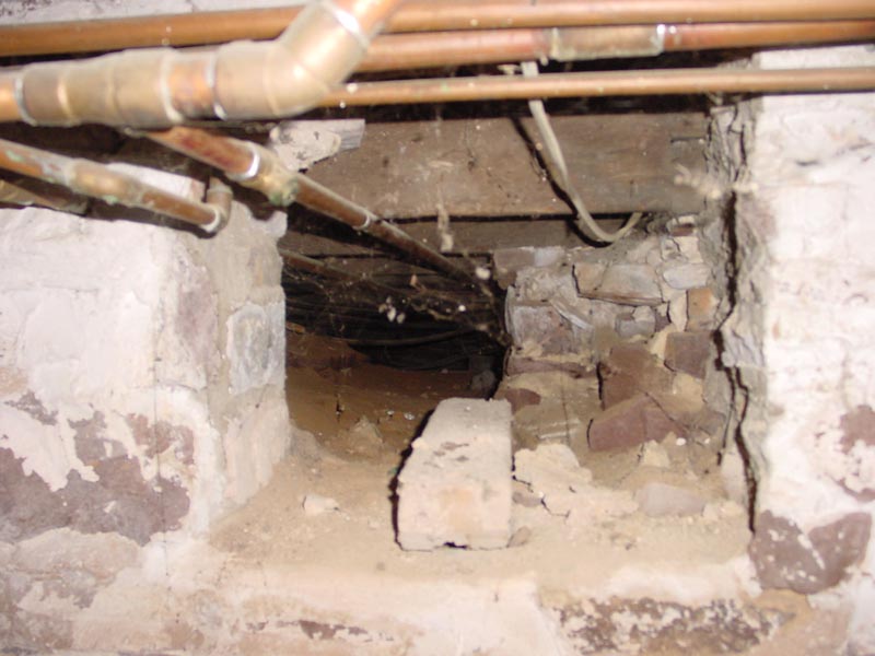 Though it might be considered a commentary upon the condition of other parts of the house, this is a certifiable hole in the wall. Note the unsheltered pipes that go under the kitchen. Thankfully, due to poor insulation and the resulting heat leakage, these pipes don't quite freeze in the winter. Visible due to the flash are the foundations for both chimneys that used to reside in the kitchen. They've since been closed up. Not visible in this picture are the three bodies, one of which is a defiled and restrained zombie, that are stored around the corner next to the crypt and altar to Ba'al. [ Look left to the shelves | Back to by the stairs | Look right to the workbench ] |