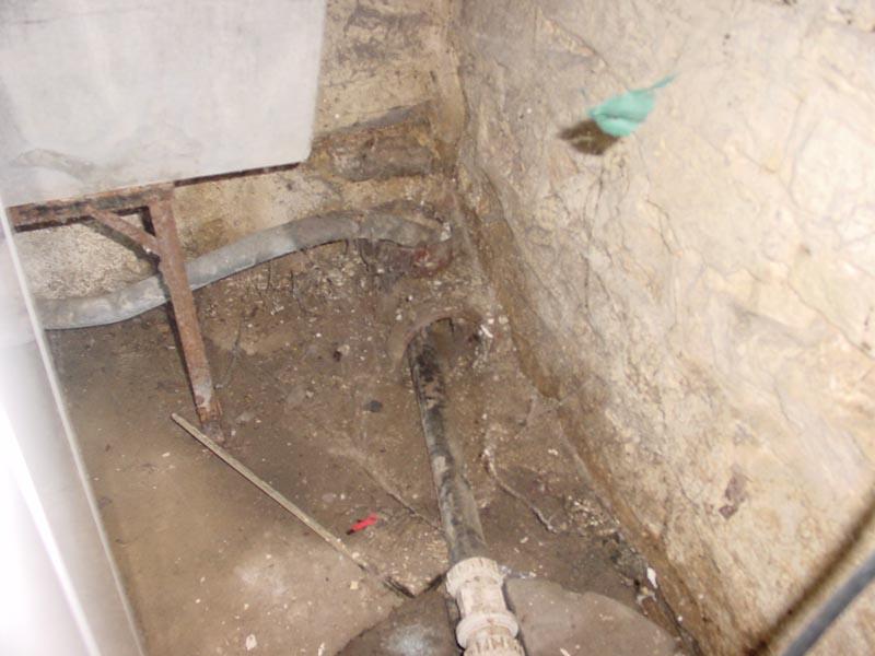 Both the sink and the sump pump drain into an open ended 6-inch-wid cast iron pipe that seems to be embedded in the floor. About what I can figure, it drains out in the front yard about 20 yards away from the house. That would mean that when the house was built, this was a natural way of keeping the absement from filling with water as the pipe travels downhill the whole way. Who knows? [ Back ] |
