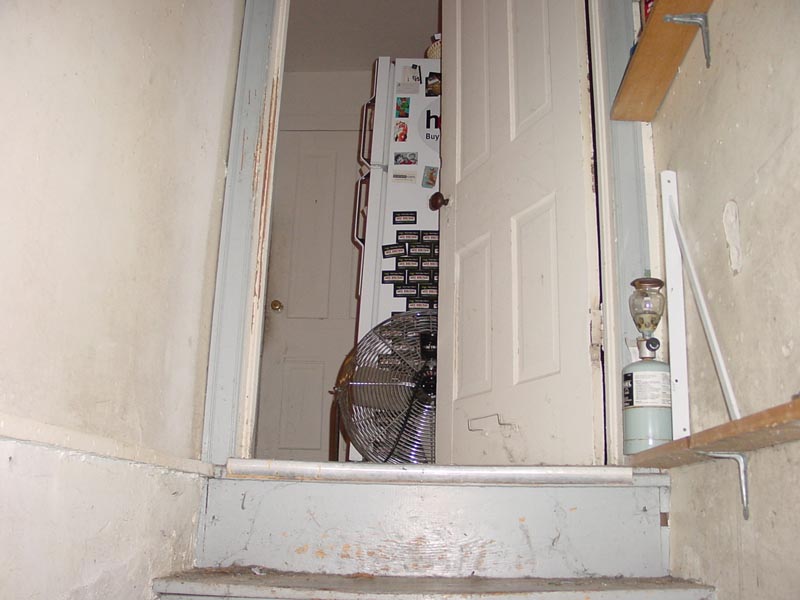 Up the stairs to exit the basement enclave and back into the kitchen. Make sure to shoo any cats back up into the house so they don't get lost down in the basement. As you rise into the kitchen you can see the side of the refridgerator which is decorated with a display of fantasy and ex-dot-com magnets. [ Into the kitchen ] |
