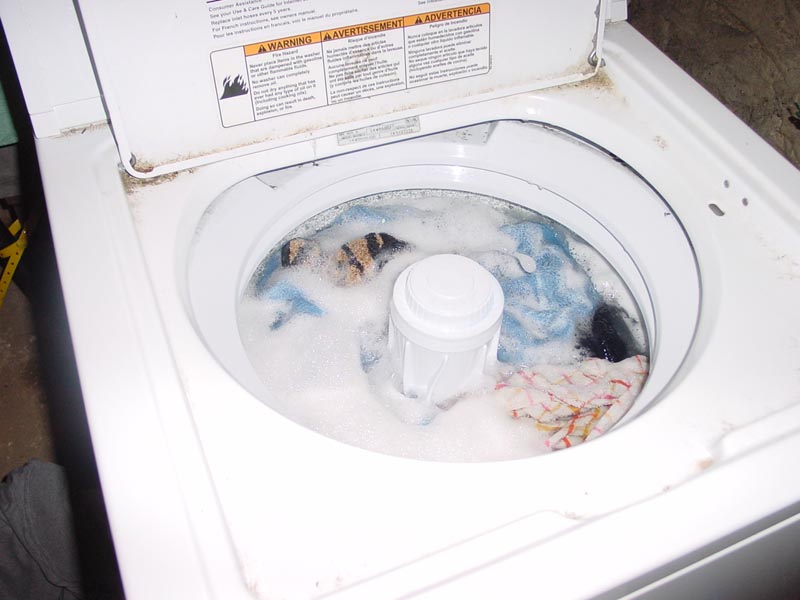 It appears to be a sudsy load of towels. Note the dirt in the edges of the washer. Dusty basment.
