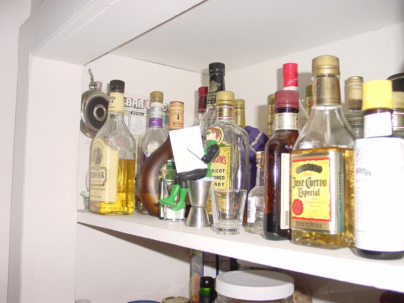 There are creative people in this house. There are also toy-collectors in this house. Beware of where the twain shall meet. It does appear that Green Lantern has decided to take a break from guarding the Vermouth and is using our shot-measuring jigger as um... facilities.