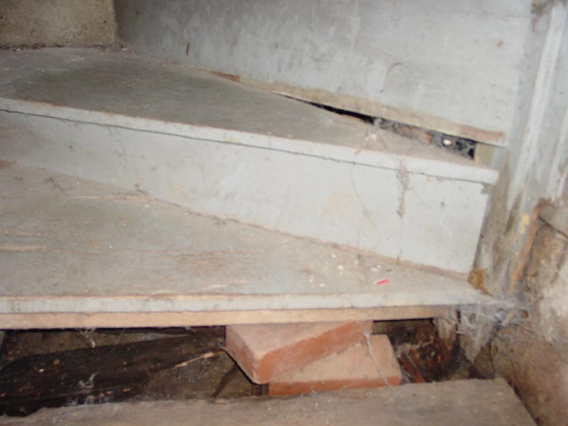 The bottom three corner steps are well constructed of solid wood, so why are they so wobbly? With no adequate attachment on the inside of a corner, they rely upon internal supports for that side. This is a natural design for corner stairs. Unfortunately, there is no cement under the stairs and the wood supports are buried in the sand and dirt. Over time the moisture has rotted these supports, especially on the bottom step. Note how the support has been replaced with two stacked bricks which tend to rot at a far slower rate. |