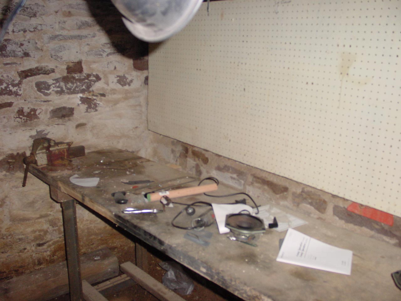 Featured in Kevin's tour of his basement is a separate room for his work activities. He doesn't have a thing on this workspace. While ducking the beams and tripping over electric cords being used to carry power from the only available and quite dirty source on the other side of the room, you can focus on the centerpiece of this area, the workbench. It features a pine top hammered on to some boards and table legs that appear to have been slapped together by someone lacking a basic understanding of woodworking. The entire design could be described as "organic" since it is neither square, nor sitting level, nor stable. A selection of tools that looks like they might successfully replace a light-bulb are available. As well as trash from a previous "unbox the car stereo speakers" project. The vice in the background is at least 30 years old and is as loose as a octogenarian whore. [ Look to the left at the wall | Back to by the stairs | What is that on the floor? | Look right to the archway to the lesser hall ] |